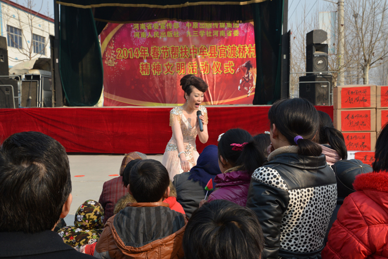 省委宣傳部副巡視員杜瑞明代表省直四家單位講了話,向官渡橋村村民送上節(jié)日的祝福。隨后,慰問(wèn)團(tuán)的領(lǐng)導(dǎo)向官渡橋村農(nóng)民群眾和小學(xué)生贈(zèng)送了文體用品。由省委宣傳部邀請(qǐng)的薛青、郝曉冬等省內(nèi)多位知名演員為村民們表演了歌舞《田野里的春天》、豫劇《朝陽(yáng)溝》選段、相聲《大腕研究》、嗩吶《百鳥朝鳳》等七個(gè)精彩的節(jié)目。在近兩個(gè)小時(shí)的演出中,臺(tái)上演員們精彩的表演,博得群眾的陣陣掌聲。省委宣傳部機(jī)關(guān)黨委專職副書記李憲林、創(chuàng)建處處長(zhǎng)張德偉揮毫潑墨,現(xiàn)場(chǎng)為鄉(xiāng)親們義寫春聯(lián)。省九三學(xué)社邀請(qǐng)的省醫(yī)療專家為鄉(xiāng)親們傳播健康衛(wèi)生知識(shí),現(xiàn)場(chǎng)檢查治療。中原出版集團(tuán)和河南人民出版社為鄉(xiāng)親們贈(zèng)送了科技圖書讓大家過(guò)春節(jié)時(shí)學(xué)習(xí),整個(gè)慰問(wèn)活動(dòng)場(chǎng)面熱烈,氛圍濃厚。